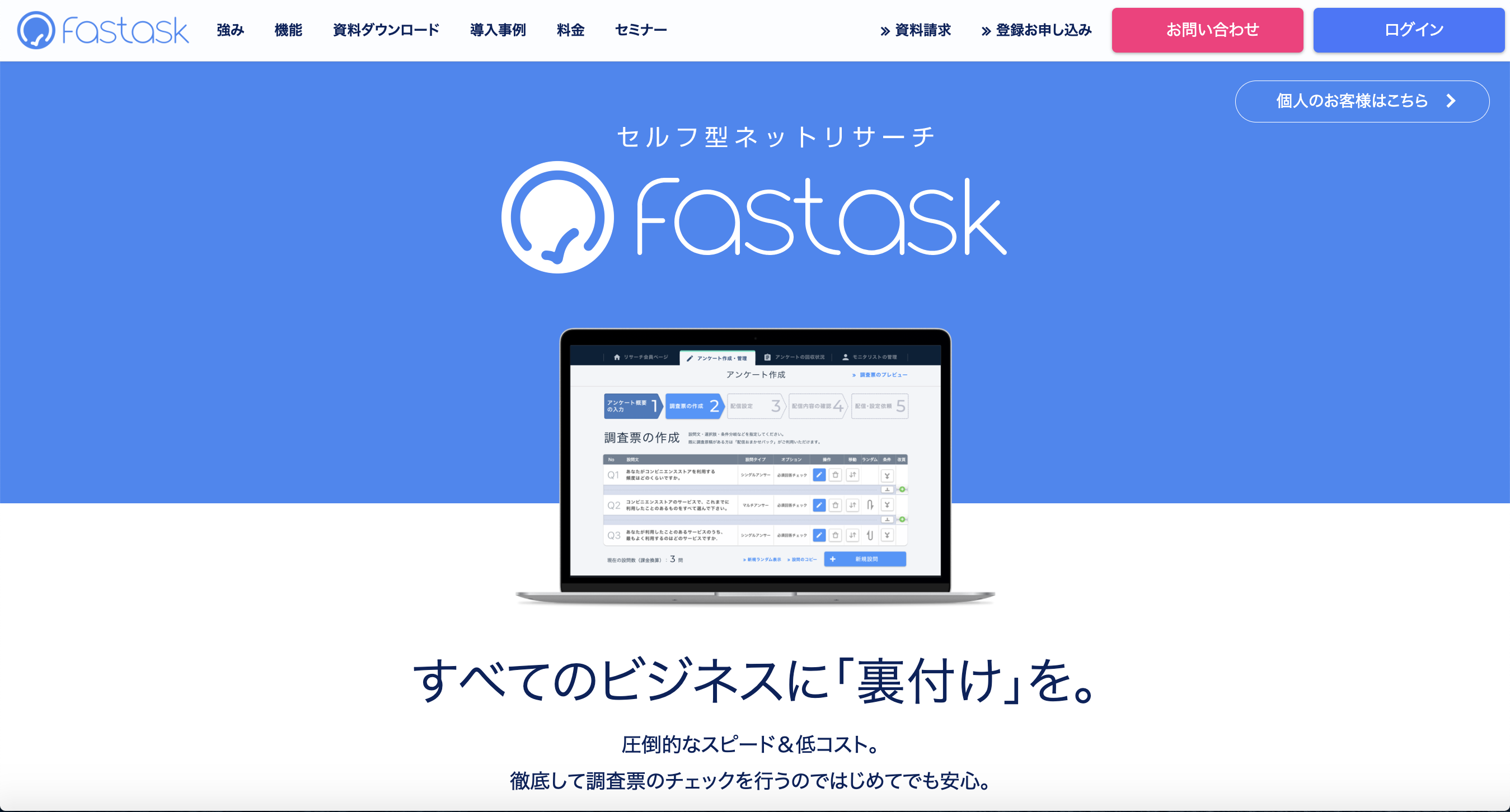 ジャストシステムが提供するセルフ型ネットリサーチサービス。調査する企業が自分で質問を作成するスタイルで、ローコスト&スピーディーな調査が可能です。従来調査の半額~10分の1の費用で、即日~数日で調査が完了します。